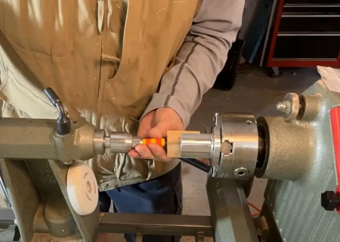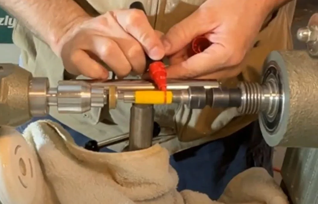Now, we’ll assemble the pieces onto a pen mandrel. If you’re like me, having the corresponding bushing kits is a lifesaver—it helps ensure the blank is turned to the correct size. Once everything is in place, you can start turning the blank down to the bushings, adding whatever shape and style you’d like to the handle.
