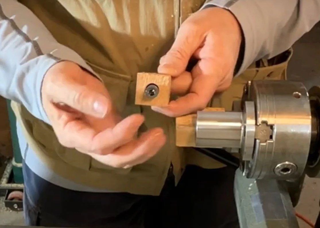 First, grab your blank. I’m using a pine scrap from the shop. Cut it down to size, leaving it just longer than the pen tubes—about 1 7/16 inches is perfect. Using your lathe with a scroll chuck and pen jaws, drill a 7mm hole through the blank.