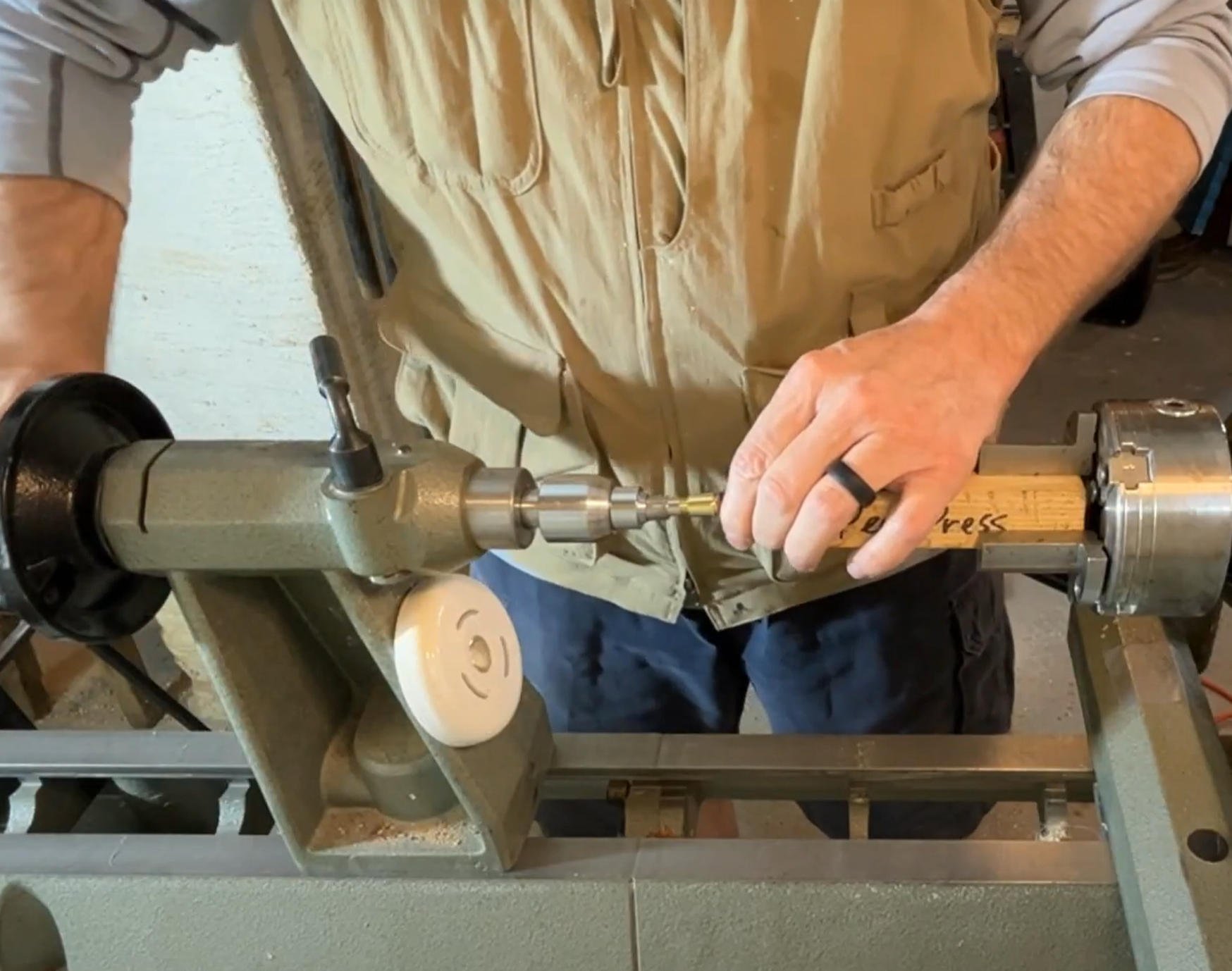 Once the glue has dried, return to the lathe and use a barrel trimmer to face off the ends of the blank, trimming them down to the exact size of the pen tubes. Next, assemble the pieces onto your pen mandrel, making sure to use the corresponding bushings that come with your kit. These bushings make it easy to size your blank as you turn it.