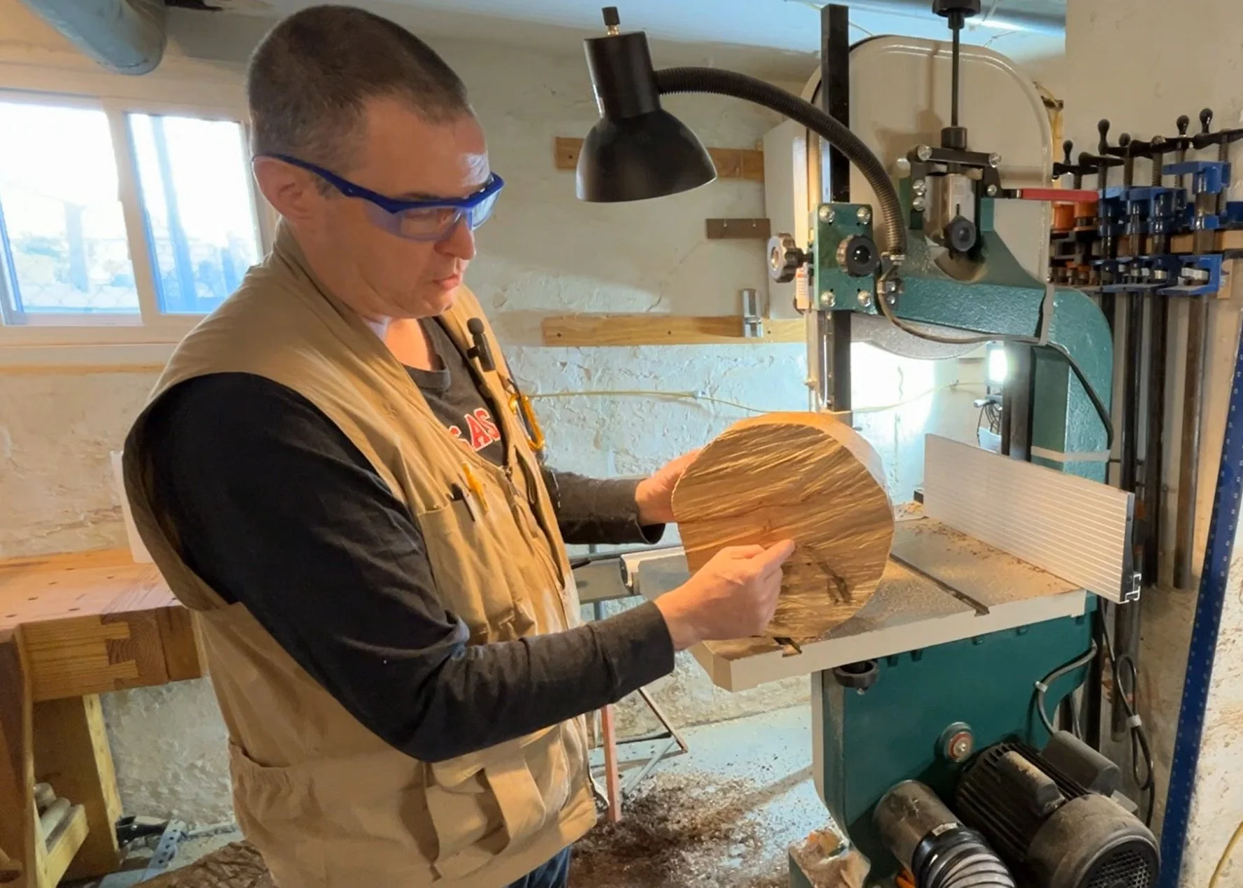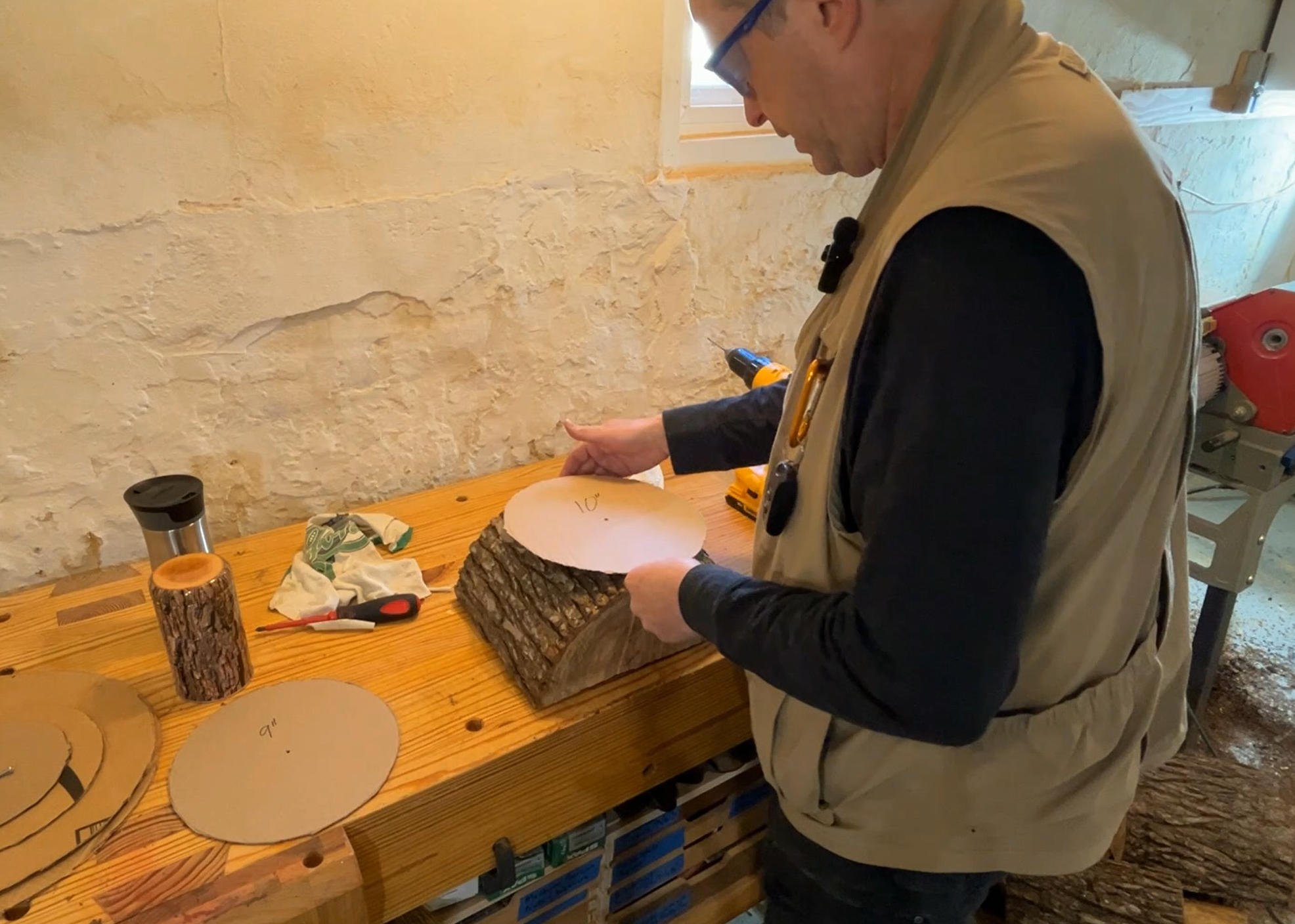 With our log halves ready, I take them to the bandsaw to get a rough circle. Using cardboard templates, around 9 or 10 inches in diameter to match the segments we just cut. After drilling a small pilot hole, I secure the template and cut along the edge, creating a round blank.