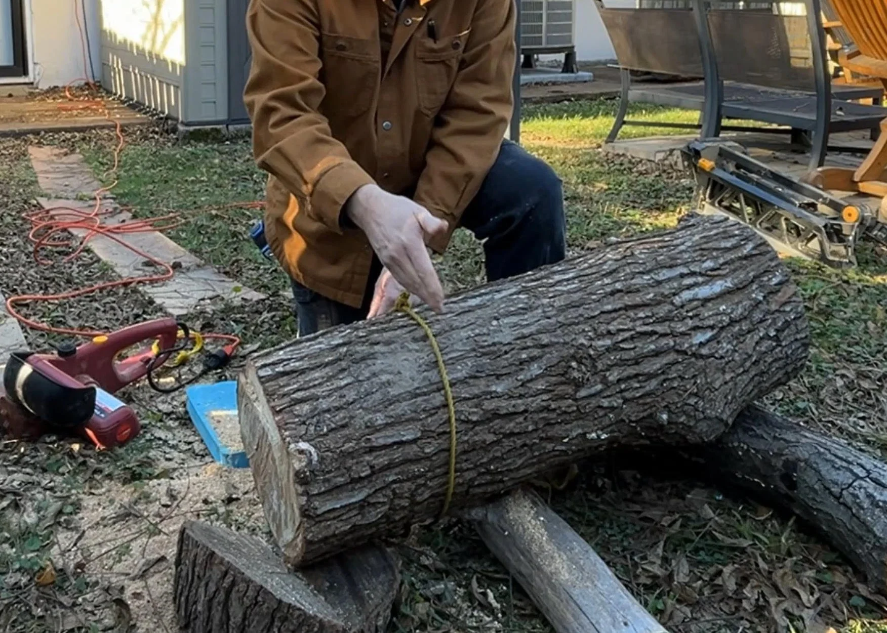 To make a clean, straight cut, I wrap a rope around the log to mark the circumference. This rope guide helps keep my cuts even, and while spray paint can make marking faster, the rope alone does the job here.