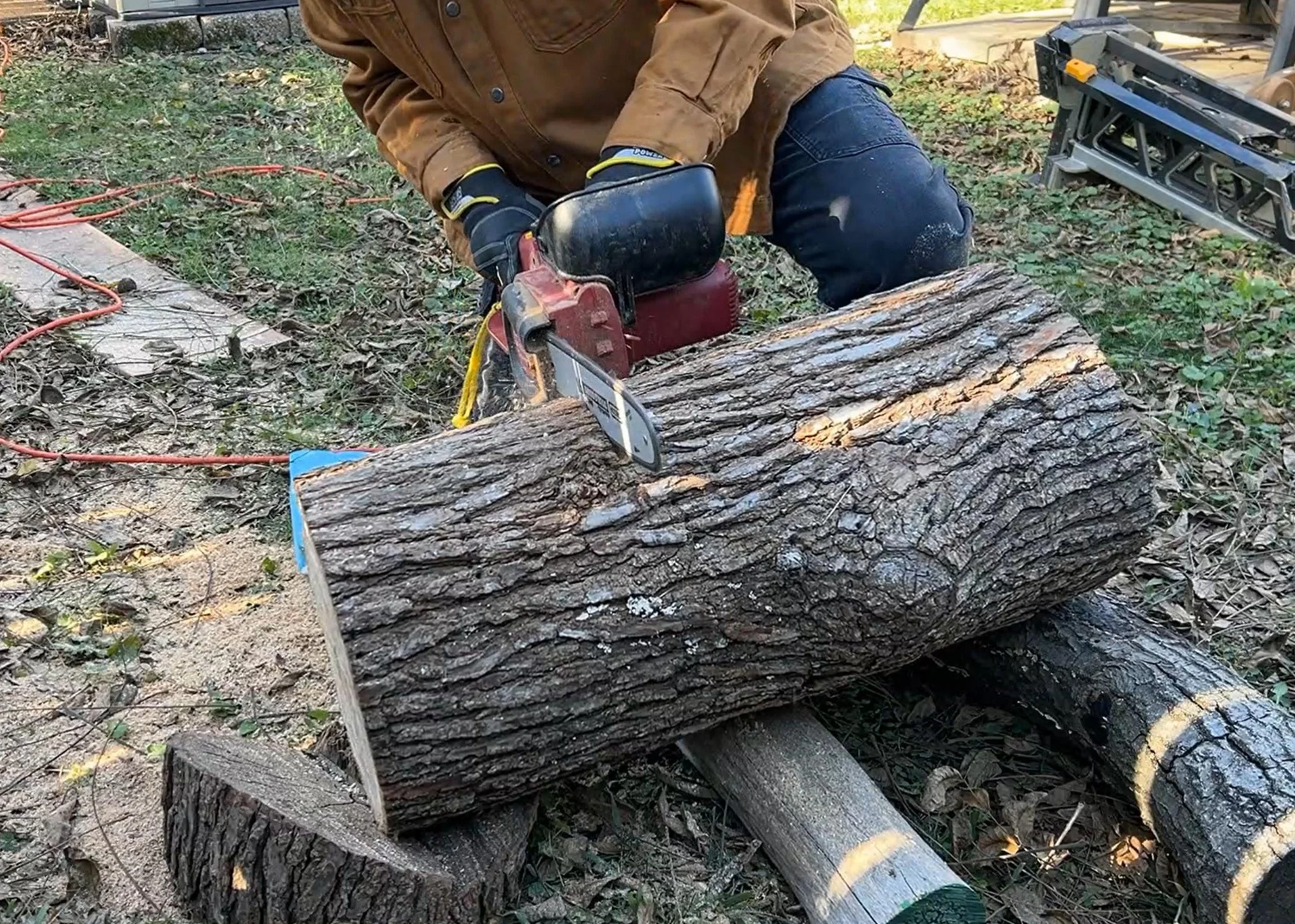 With the log marked, it’s time to bring out the chainsaw. I make a cut at each mark, creating two 10-inch segments. This will give us enough wood to turn a pair of 8-inch bowls.