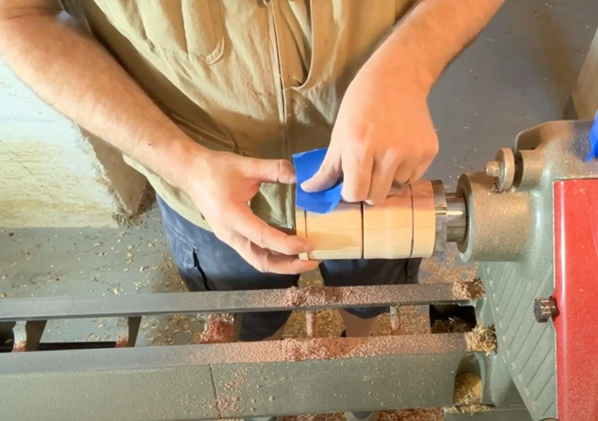 Next, we’ll flatten the end of the piece and sand it through various grits (starting with 100, then moving to 150, and finally 220). Once you’ve achieved a smooth surface, mark in about 3/8 inch from the end, connect the lines, and part it off. If your workpiece has unique grain patterns, consider using a saw to preserve the wood grain alignment. Set the lid aside for now.
