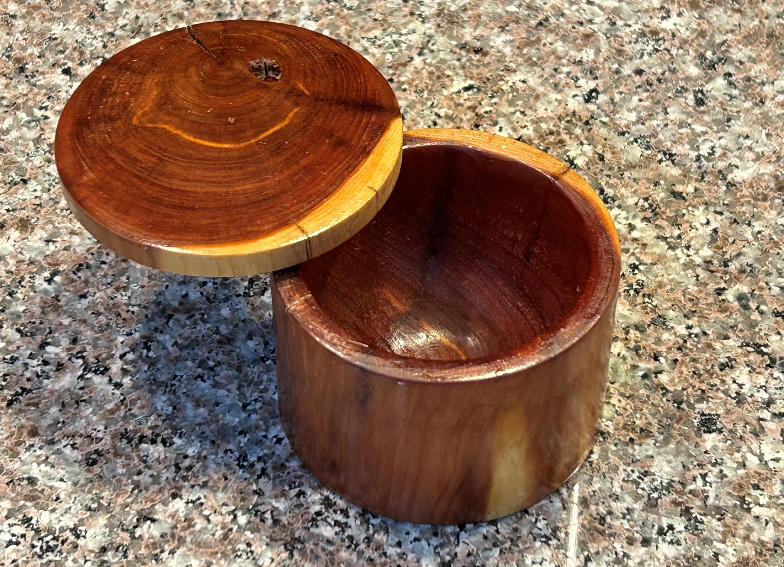 To finish, part off the box and prepare to attach the lid. Make an alignment mark on both the lid and the box. Drill a small hole in the shoulder of the box and the lid, then insert a small, clipped nail (I use nails clipped from aluminum pop rivets) to create a pivot point for the lid. Now, it’s time to apply your favorite finish. If you’re planning to use the box in the kitchen, I recommend finishing with shellac.