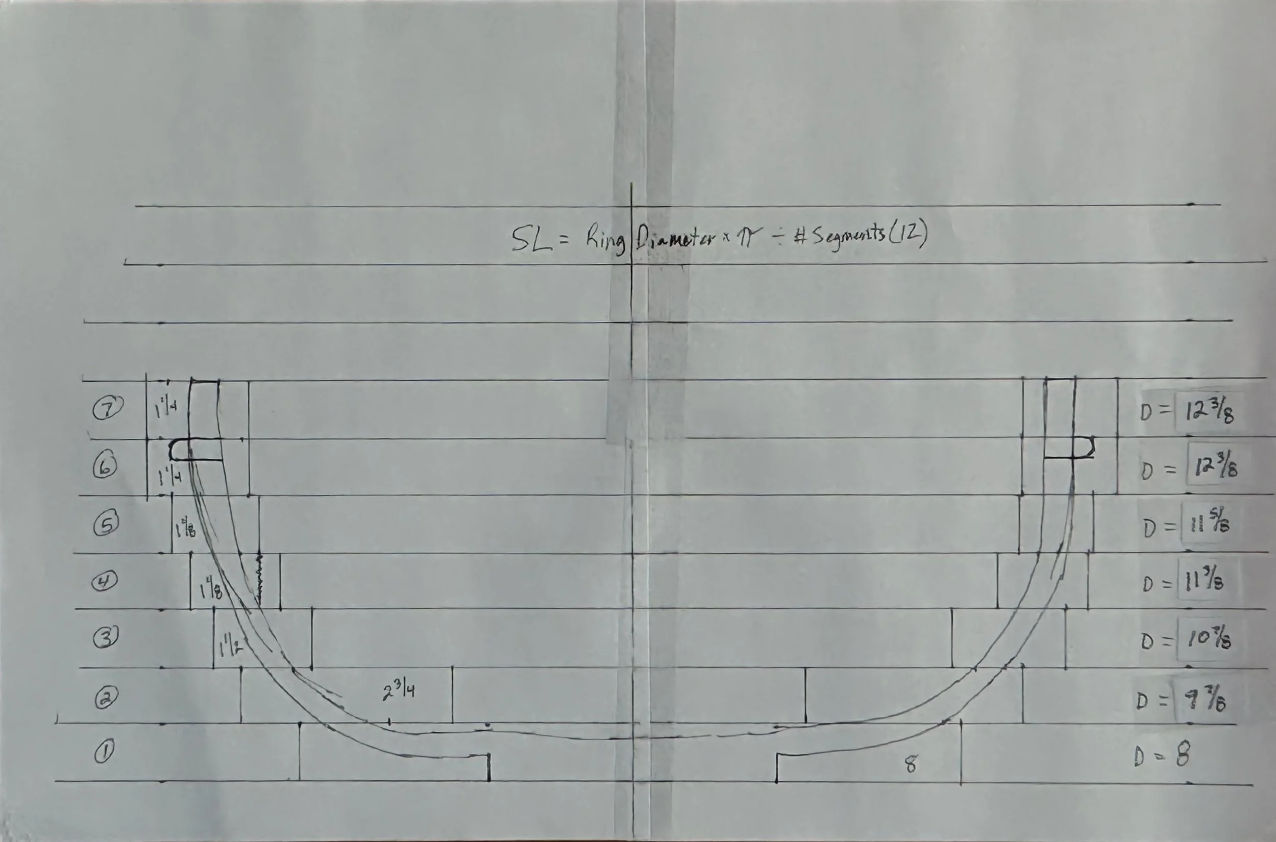 We calculate the segment lengths for each ring. For example, a ring with a 10 3/16-inch diameter results in segments approximately 2.75 inches long. Once calculated, compile your cut list for all rings to ensure efficient material use.
