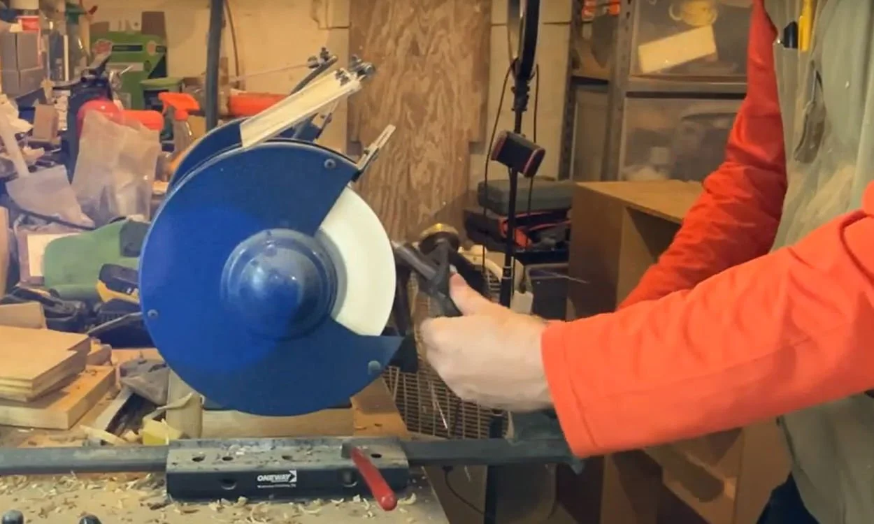 A successful turning project relies on sharp tools, so I start at the sharpening station. I recommend using jigs for consistent, fast sharpening. My primary tool for this project is a half-inch bowl gouge, perfect for most roughing tasks. Starting with sharp edges makes turning more efficient and smoother from the start.