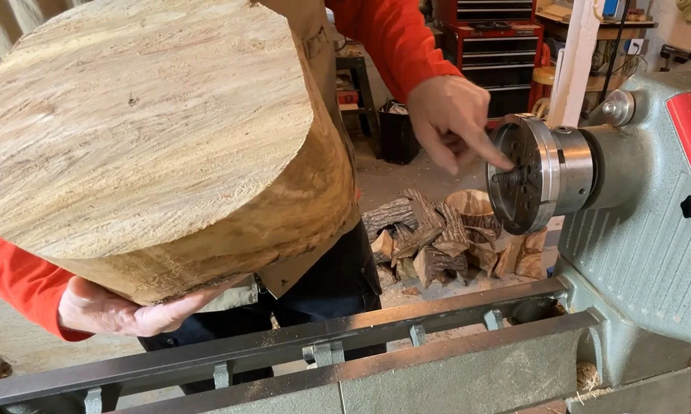 We begin with a section of a green log mounted on the lathe. For this, I use a wormwood screw mounted in a scroll chuck. After drilling a pilot hole in the center, I screw the blank onto the wormwood screw. Alternatively, a faceplate can be used for mounting, which provides extra security, especially if the blank is prone to stripping out at the center.